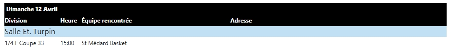 | COUTRAS GUITRES BASKET (+14) | 73 | - | 71 | LES FILS DE ROLAND DE BLAYE |