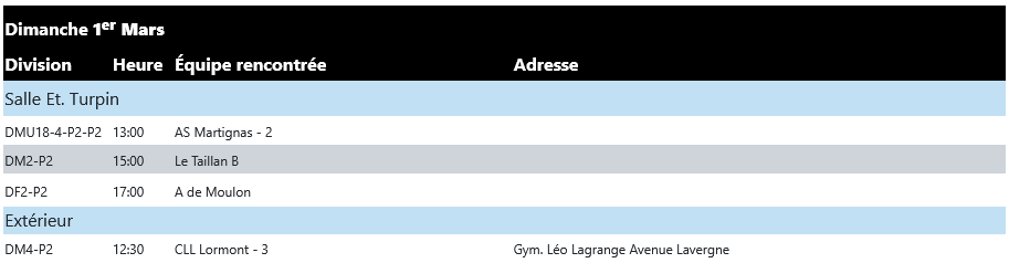Poule et calendrier des équipes...