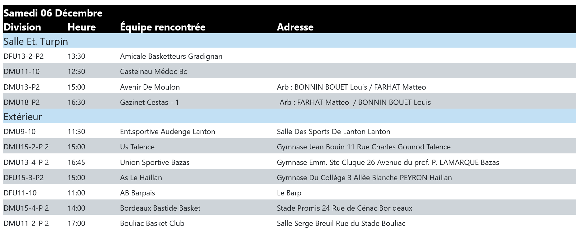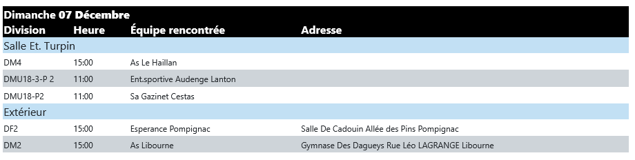 | BASKET BASSIN D'ARCACHON (+21) | 20/12 | AS ST DELPHIN | |